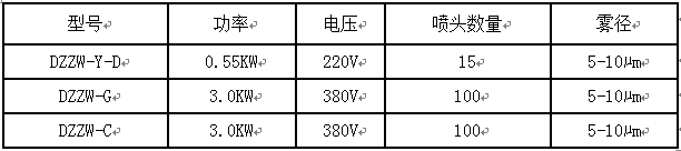 景觀工程應用實例 噴霧加濕設備-----工廠、養殖場、公共場所系列 型號: DZZW-C 電機:國產電機 泵浦:意大利高壓柱塞泵,免維護,使用方便 過濾:5微米精密過濾,保護噴頭不會堵塞 保護:斷水保護,自動感應水壓,保護系統不會在無水情況下運行 防震:雙重防震,使系統在運轉時不會產生共振,降低設備噪音 控制:遙控器+時間控制,本機配50米遙控器